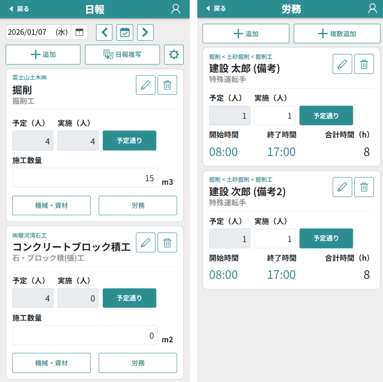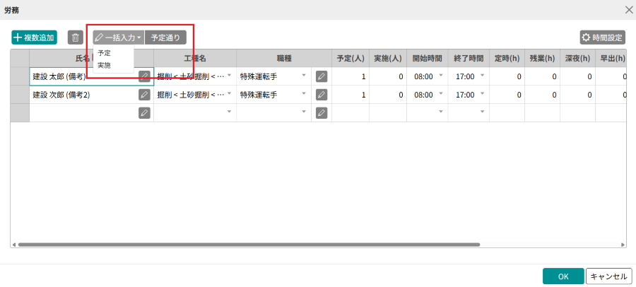 日報の労務入力をする際、予定と実施の一括入力及び、予定を一括で実施に反映させる機能を搭載。