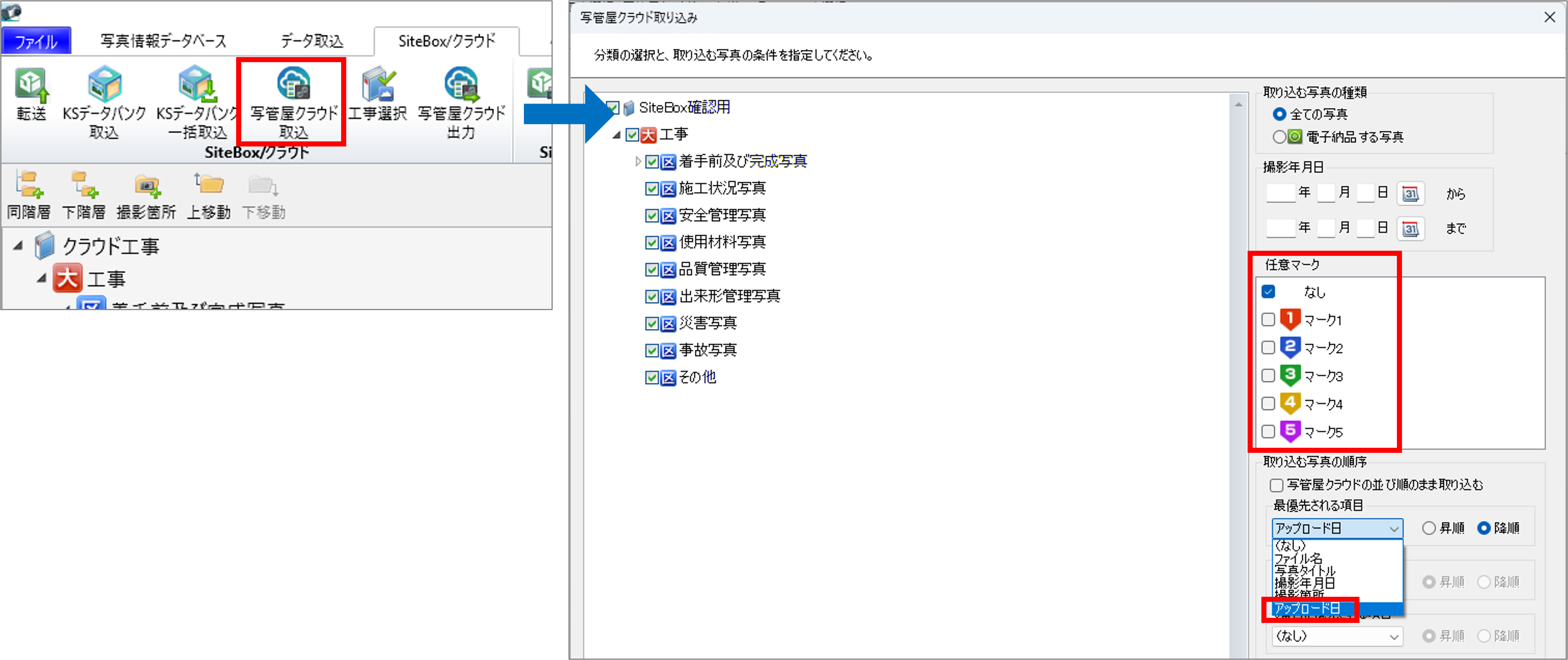・「写管屋クラウド取込」の取り込む写真の条件を変更