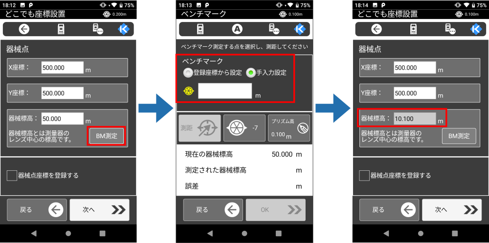 どこでも座標設置時に、器械標高をBM測定から計算できるように対応します。