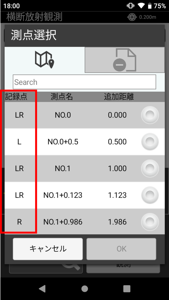 横断放射観測(路線)の測点選択画面にて、L側R側どちらに記録データが存在するかをわかるように対応します。