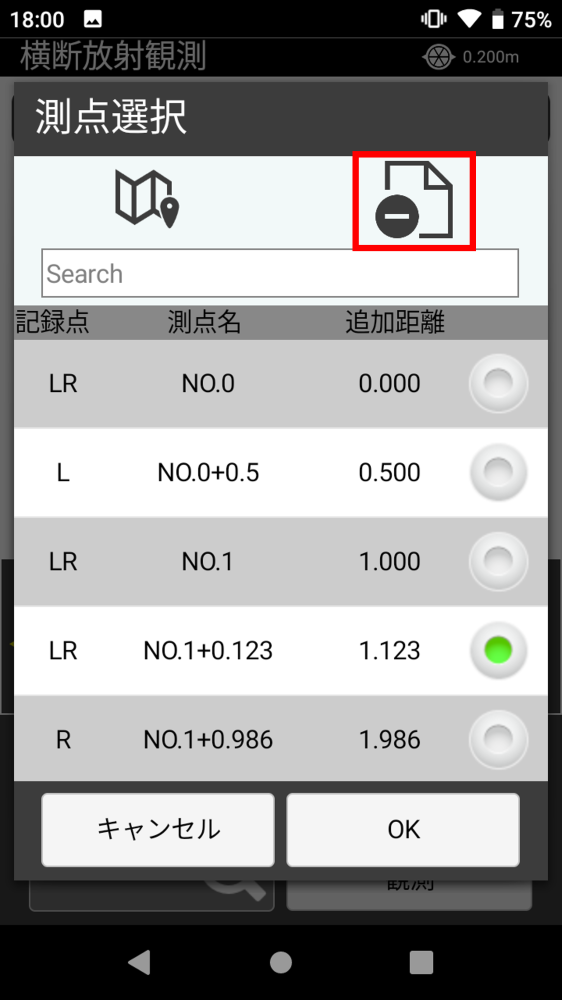 横断放射観測(路線)の測点選択画面にて、不要な測点を削除できるように対応します。