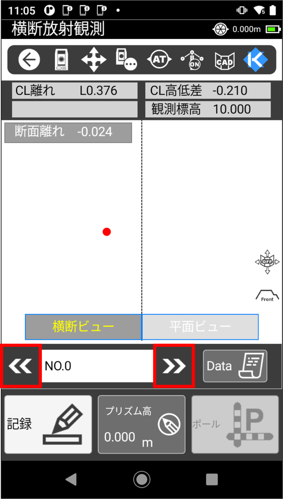 横断放射観測(路線)の観測画面にて、測点送りボタンから測点を切り替えられるように対応します。