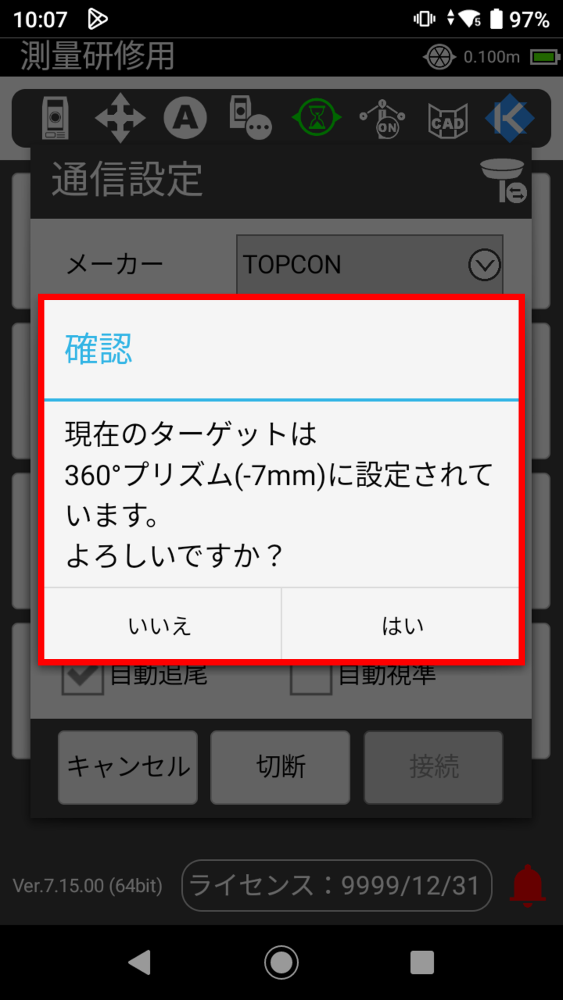 器械と接続した際に、現在設定されているプリズム定数が確認できるメッセージが表示されます。