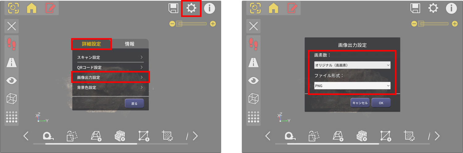 快測Scanの体積や面積の結果を画像として保存する時に、ファイルサイズが大きくなりすぎないように画像の画素数とファイル形式を設定できるようになります。