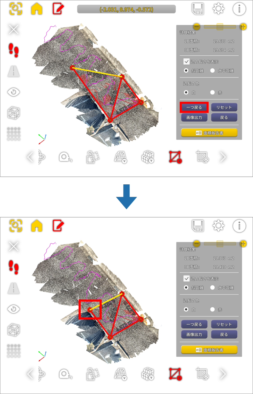 4.「一つ戻る」をタップすると、端点が移動する前の位置に戻る