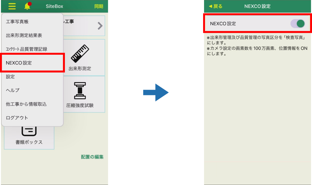 従来のNEXCO設定は、出来形測定・コンクリート受入試験・圧縮強度試験で写真を撮影する際に区分名を自動的に「検査写真」に変更する機能でしたが、加えて位置情報を有効、画素数を100万画素で固定できるようになります。