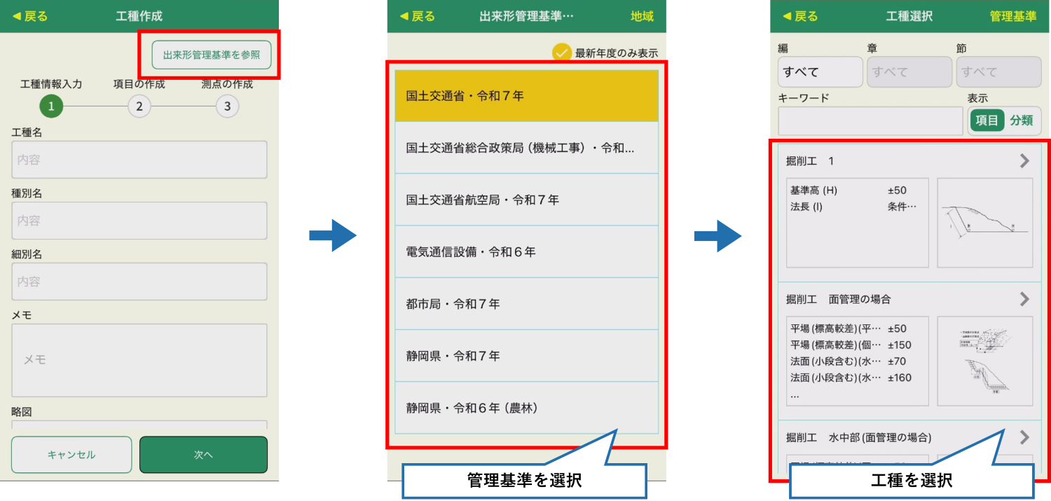 出来形測定にて工種を作成する際に、出来形管理基準を参照して工種を作成できるようになります。