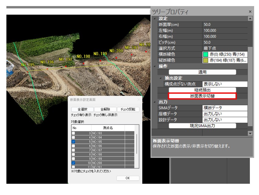 断面編集せずとも一括保存が可能となり、表示切替で絞り込んだ測点断面のみの現況SIMA出力も可能となります。