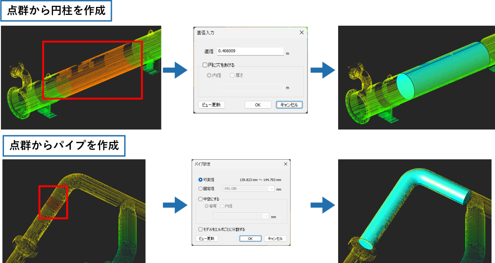 ・点群からソリッドモデル(円柱・パイプ)を作成する機能を搭載
